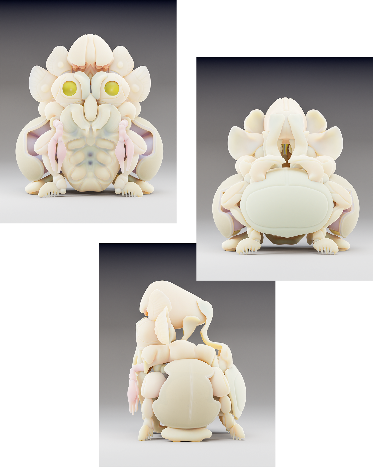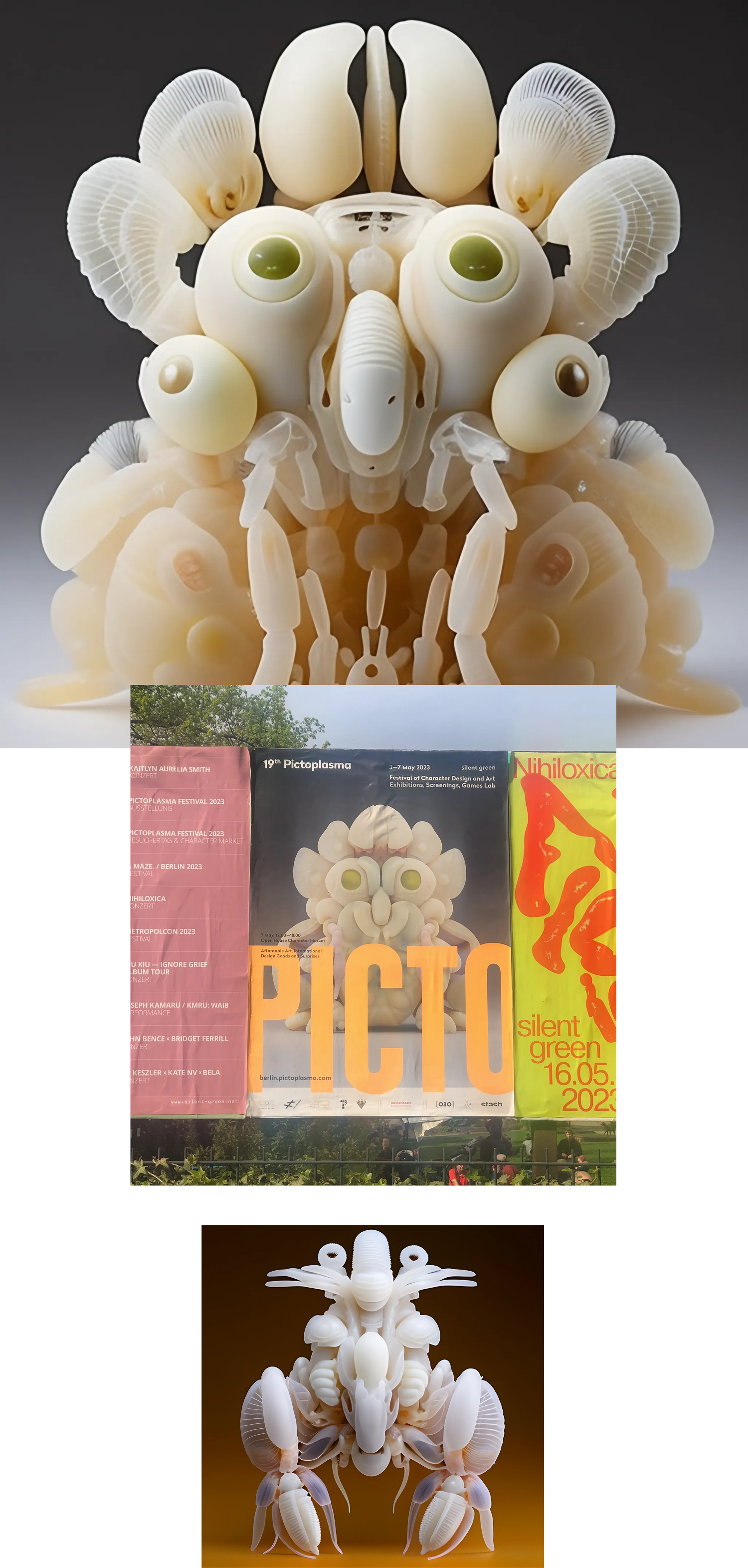 Created using the output of a custom fine-tuned model to create a 3D sculpted and rendered creature for Pictoplasma.